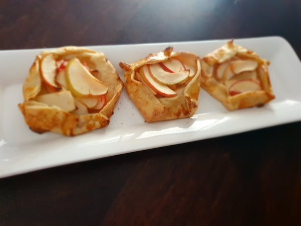 Preheat your oven to 180C. Cut out four 14cm rounds and place on a paper-lined baking tray. Core apples, then cut into thin wedges. Place in a bowl with lemon/lime juice, ginger and toss until combined. Place apple filling in the centre of each pastry round, leaving about 3cm border. Fold over pastry edges to partially Β enclose the filling, pressing down lightly with your fingers to seal. Brush pastry edges with egg yolk and sprinkle with extra sugar. Bake for about 25 minutes or until golden and crisp. Serve with custard or icecream. Enjoy!