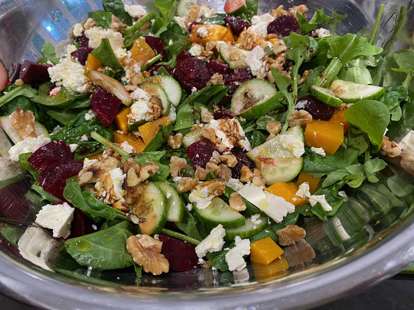 Mix together all remaining ingredients in a large bowl. Toss through beets and pumpkin.