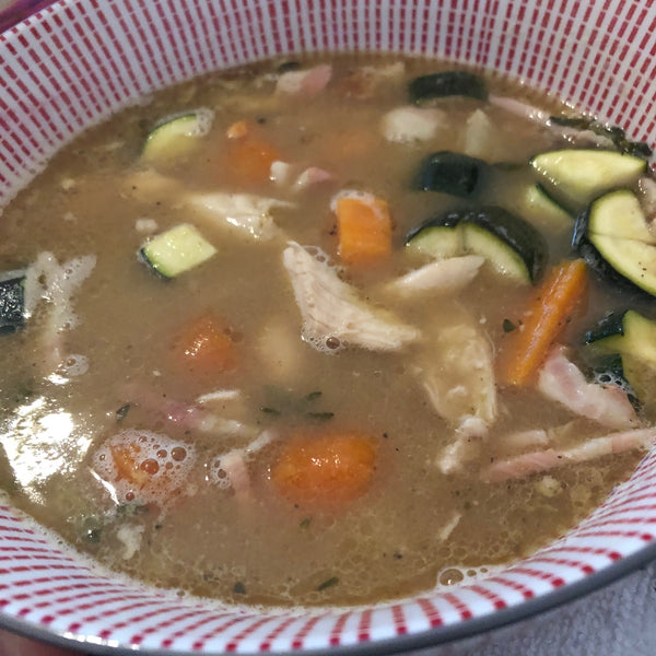 Add the remaining veg and bacon into the strained chicken soup liquid and simmer for another 30-60min.