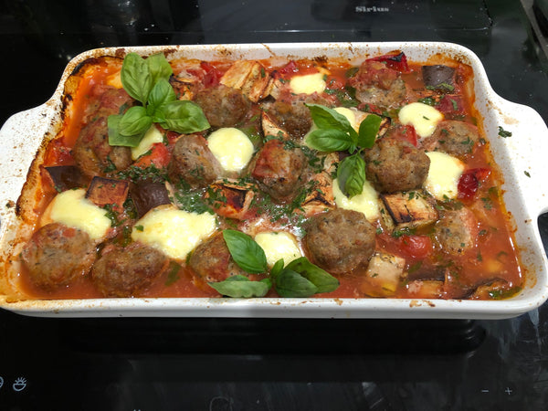 Mix all ingredients together (except cheese and herbs) in large oven tray