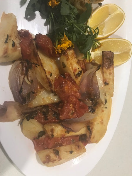 Toss everything together. Please in a greased baking dish and bake for an hour at 200 degrees Celsius, stirring occasionally to ensure nothing sticks