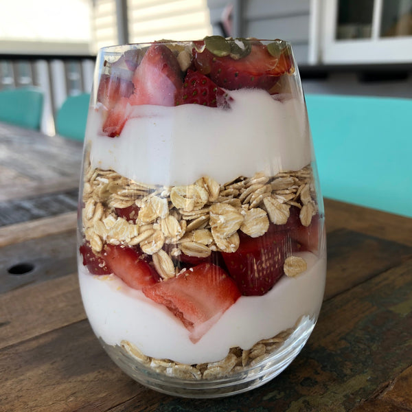 In a large glass layer half the oats, half the yoghurt then half then strawberries then repeat with remaining oats, yoghurt and berries. Top with honey and seeds.