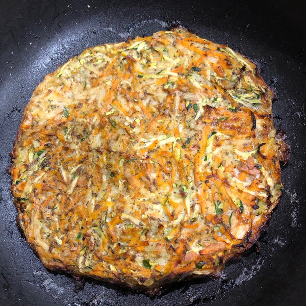 Bring a large frypan to medium heat. Add 2 tbsp olive oil. Spread rosti mixture evenly over frypan. Cook for 5min until lightly brown. Carefully flip rosti over. Now place frypan in oven for 30min or until golden on top.